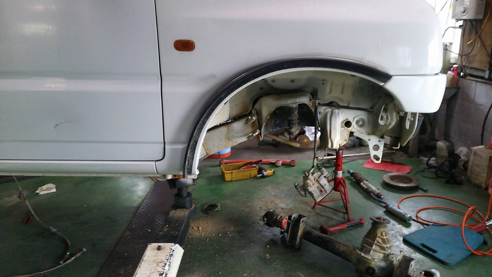 リヤから!コイルのとこも鉄板でつないで開いて曲がるのを防止。