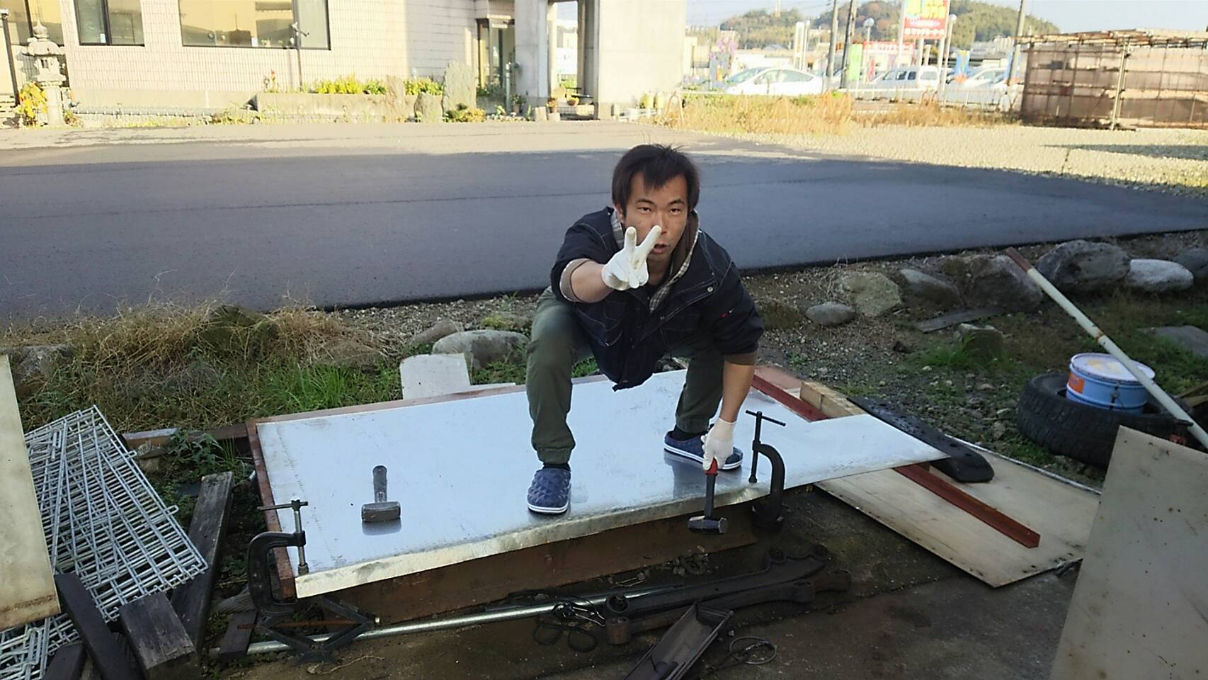 奥やんと角を一生懸命ハンマーでたたいて曲げてます(ー_ー)!!